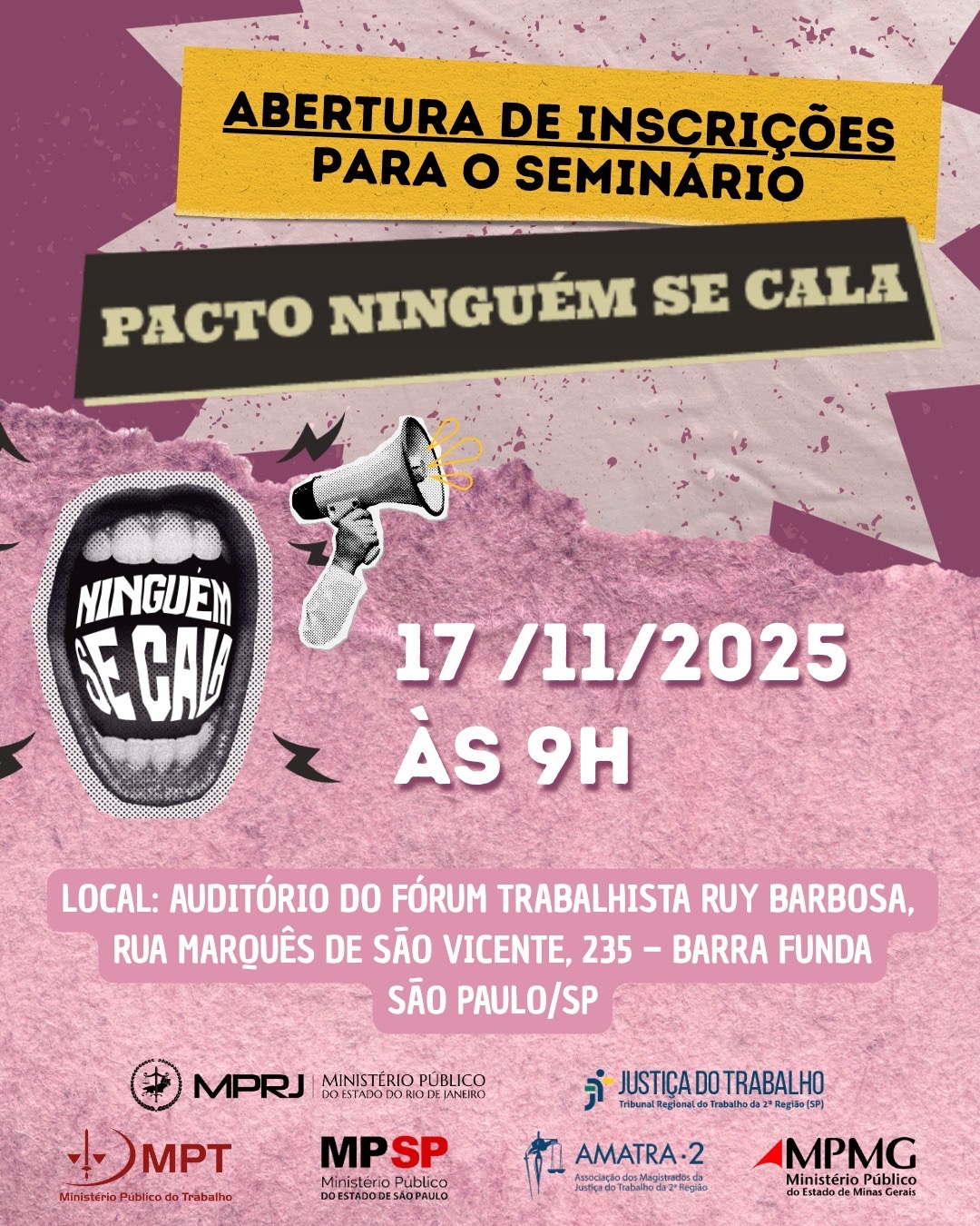 O evento será realizado no Auditório do Fórum Trabalhista Ruy Barbosa (Rua Marquês de São Vicente, 235, Barra Funda).